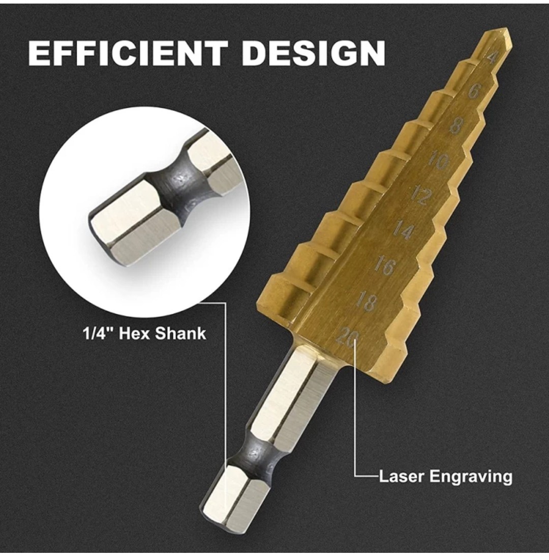 Conical profile step drill bit allows multiple hole sizes to be produced from a single bit. Recommended for softer or thinner materials. They are made for electrical knockouts, running conduit, faucet installations and more, in materials up to 1/8 In. The bits work in. materials such as sheet metal, ducts, steel, copper, brass, aluminum, plastic, vinyl siding, plasterboard, PVC, stainless steel and cast iron.