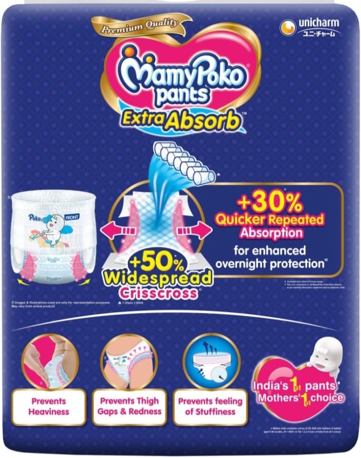 MamyPoko Pants Extra Absorb comes with new "Widespread Crisscross Sheet" with 50% extra absorption area on sides that absorbs urine quickly and repeatedly for upto 12 hours.