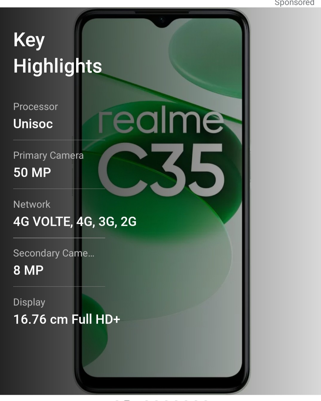 Realme C35 Mobile. Storage - 64 GB ROM & 4 GB RAM. Processor - Unisoc Tiger T616 Octa Core 2GHz . Rear Camera- 50 MP + 2 MP + 0.3 MP. Front Camera - 8 MP. Display - 6.6 inch Full HD + LCD. Battery - 5000 mAh. Network Type - 4G Volte, 4G, 3G, 2G. Sim Type- Dual Sim