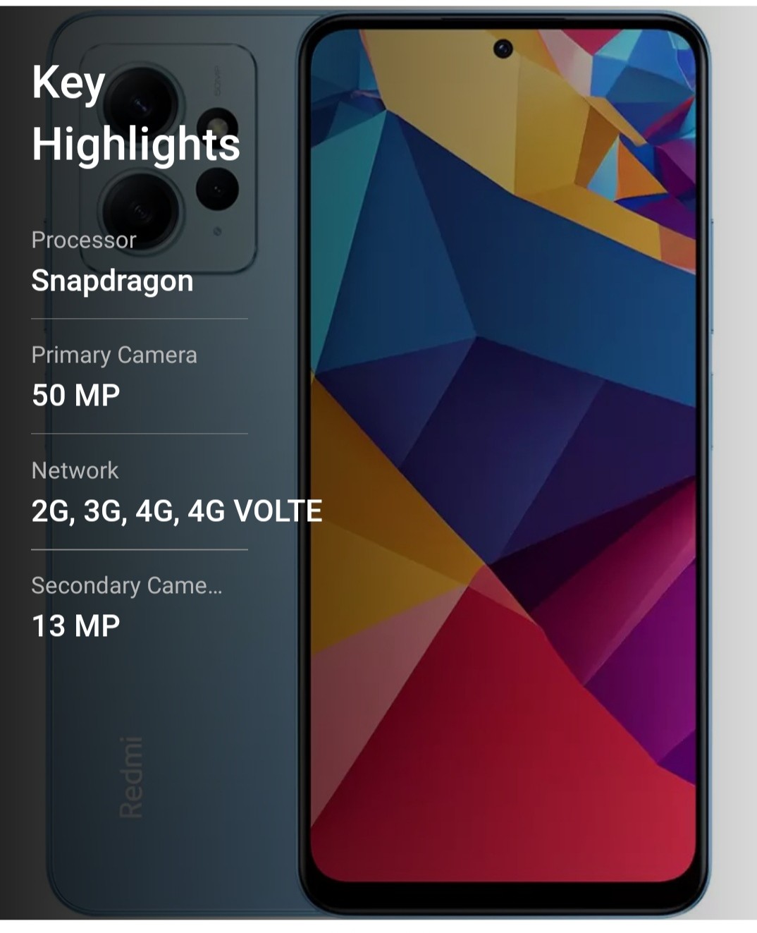 Redmi Note 12 . Storage - 64 GB ROM & 6 GB RAM. Processor - Snapdragon 685 Octa Core 2.8 GHz. Rear Camera - 50 MP + 8 MP + 2 MP. Front Camera - 13 MP. Display - 6.67 inch Full HD + 120 Hz Super AMOLED Display. Battery - 5000 mAh. Network Type - 2G , 3G, 4G , 4G Volte. Sim Type - Dual Sim