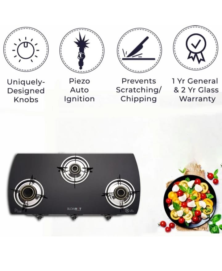 BlowHot 3 Barner gas Stove cook with sheer Ingenuity, Uniquely Designed knobs , piezo ignition, prevents scratching chipping. 1 year general & 2 year glass warranty.