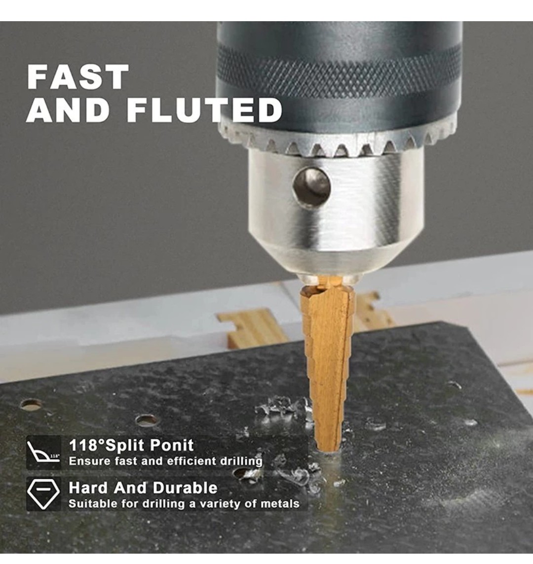 Conical profile step drill bit allows multiple hole sizes to be produced from a single bit. Recommended for softer or thinner materials. They are made for electrical knockouts, running conduit, faucet installations and more, in materials up to 1/8 In. The bits work in. materials such as sheet metal, ducts, steel, copper, brass, aluminum, plastic, vinyl siding, plasterboard, PVC, stainless steel and cast iron.